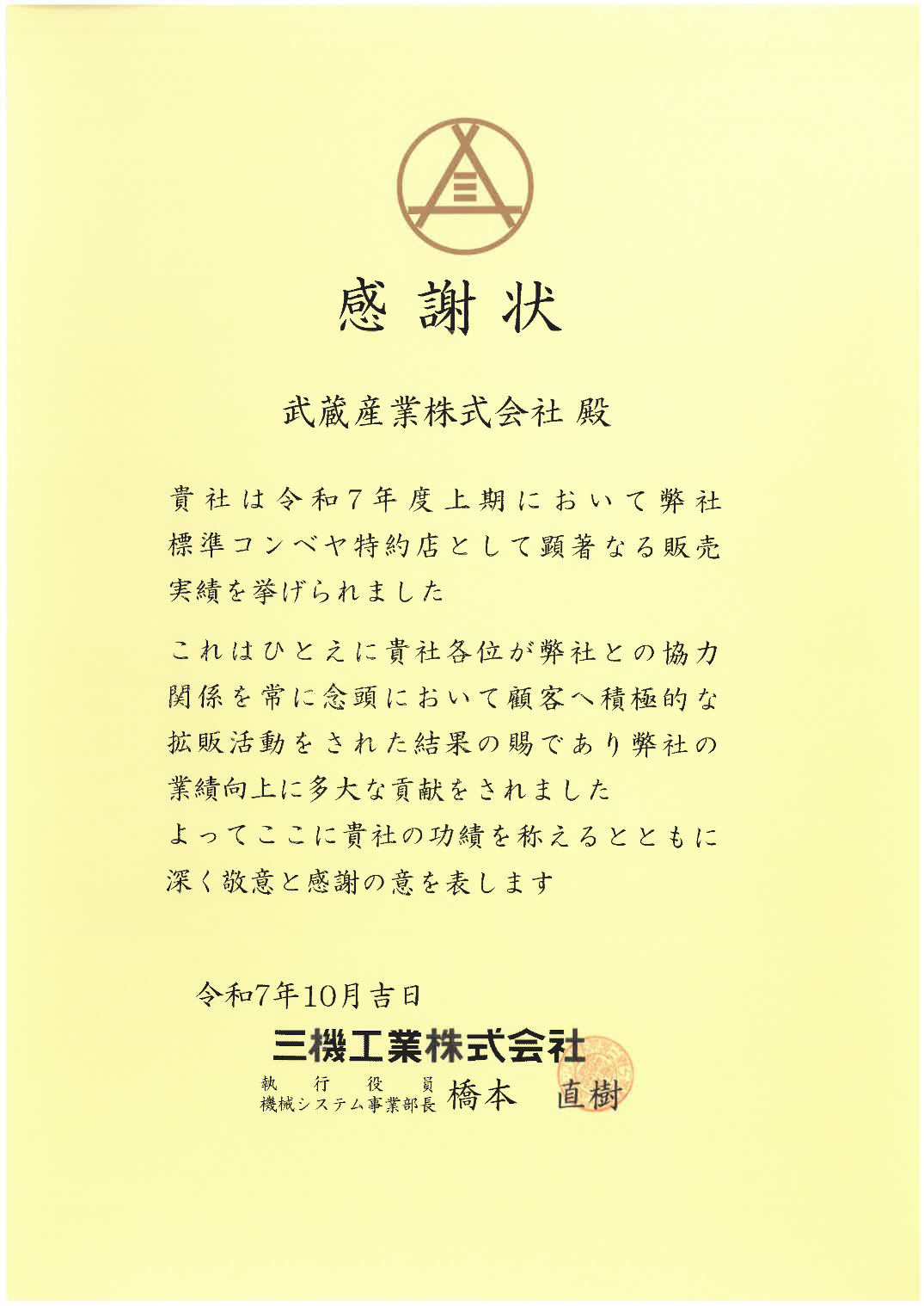 三機工業株式会社 感謝状